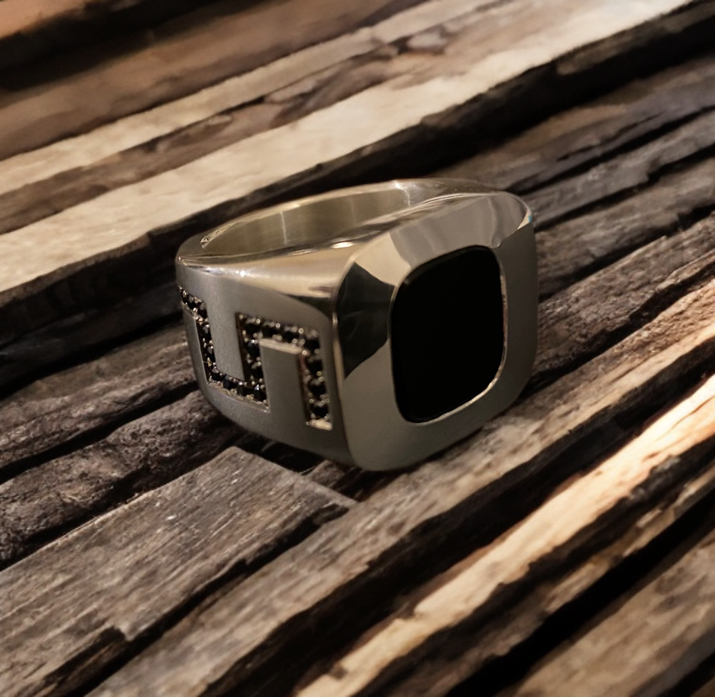 Upon closer inspection of my layered stone ring, you can see that the rough outer contour of the vehicle—especially from the middle onwards—is reflected in the design of the ring. The onyx layered stone symbolically corresponds to the roof of the vehicle. The transitions, edges, and surfaces of my ring deliberately echo the characteristic shapes of the G-Class.