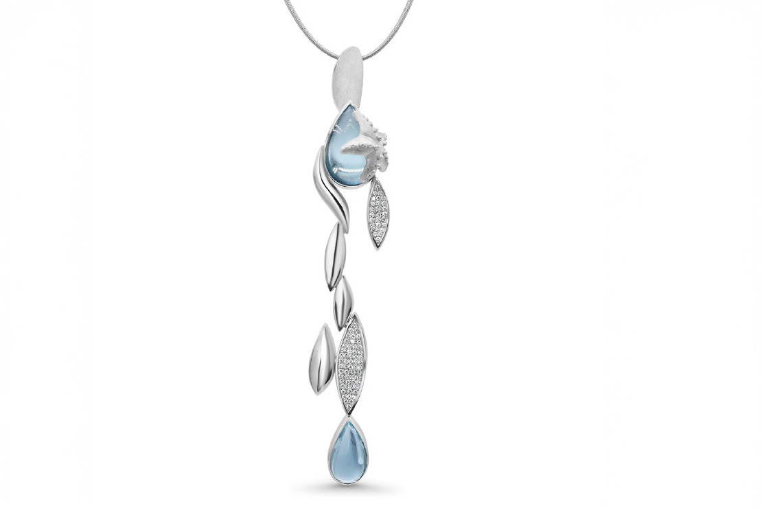 “Spirit of the Ocean” is a piece of jewelry that symbolizes the diversity of the sea. The calm, the movement, and the endless blue.