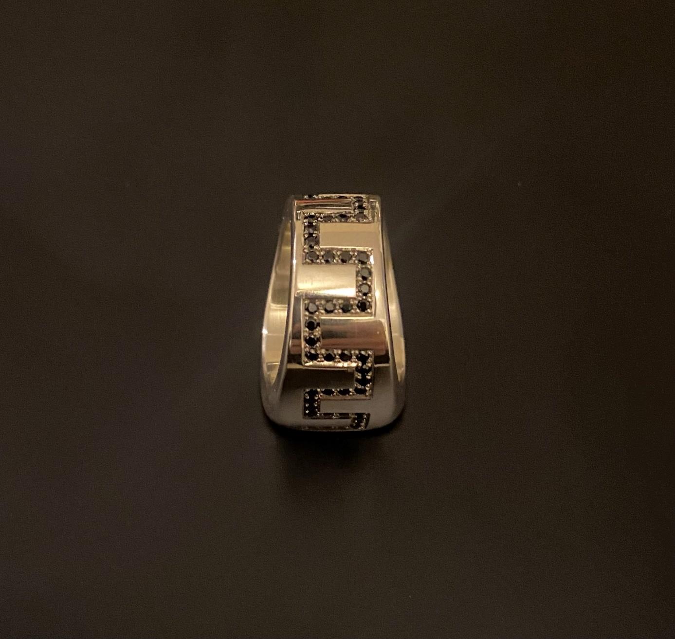 open exchange, there is no way to achieve a rapprochement between opposing sides and points of view. In my design, I try to make this idea of reconciliation visible in a point shading. Black and white blend into flowing transitions in different shades of gray, symbolizing compromise and understanding. No section of the ring repeats exactly the same pattern, emphasizing the diversity and dynamism of communication. Each section tells its own story while reflecting the larger whole.