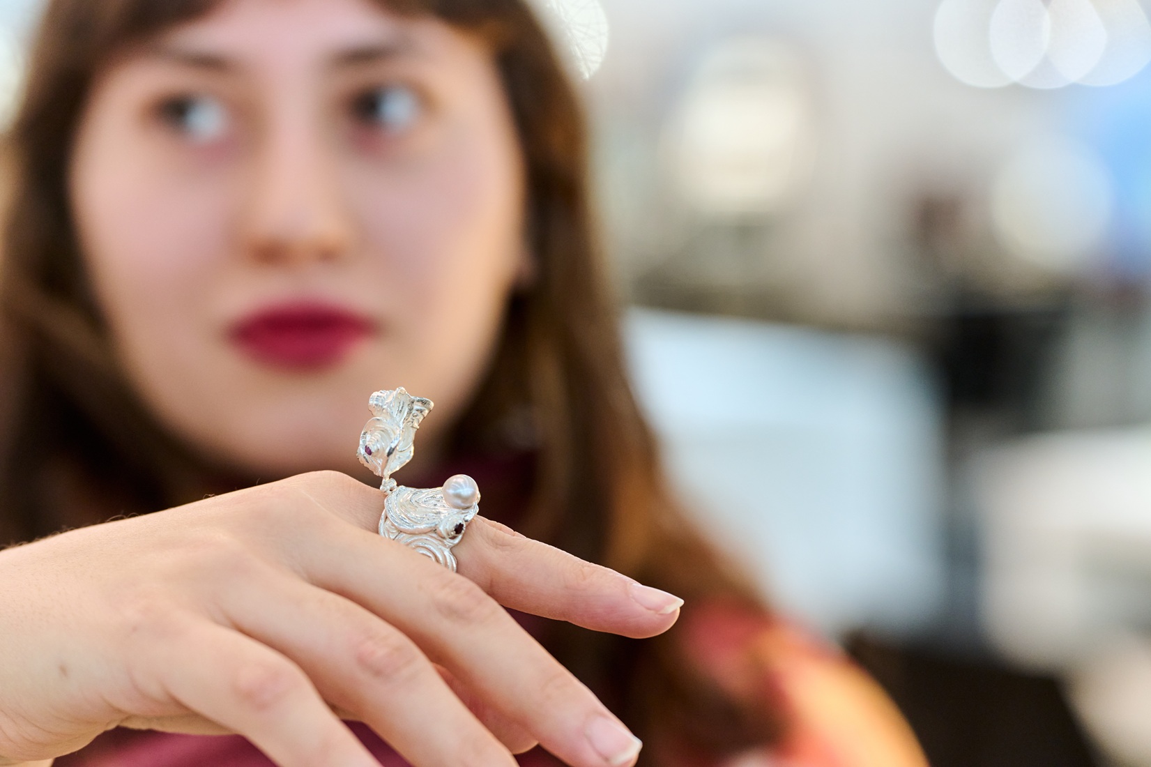 The wearability of the piece comes from the relative lightness of the ring, in spite of the larger shape, and the coiled yet comfortable band, wide but flat. Adding to the functional component is the hinged lid, which can be used to fidget and let out additional nerves but also protects the delicate surface of the pearl.
