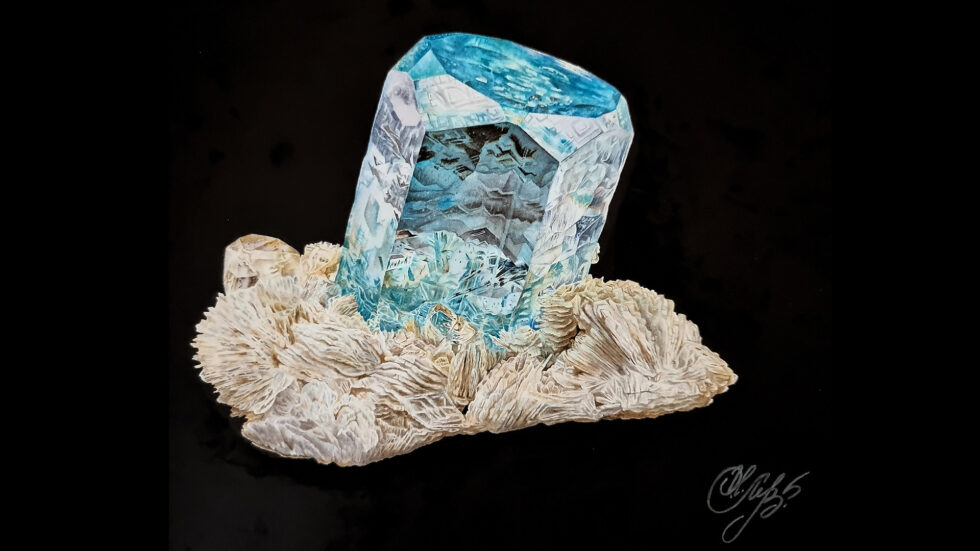 Die Ausstellung Art of Minerals auf der Münchner Messe bietet dem Betrachter die Möglichkeit, in diese Kultur einzutauchen und sie zu erleben. Fabelhafte Werke von Künstlern werden mit den Naturwundern gepaart, die sie inspiriert haben. Die Ausstellung beginnt mit historischen Exemplaren und den seltenen Originalbüchern, in denen sie abgebildet sind (darunter der Turmalin, den Oberstleutnant Michael Symes 1795 vom König von Ava geschenkt bekam und der in Sowerby’s Exotic Mineralogy (Tafel 89, Sowerby 1812) abgebildet ist), führt die Ausstellung in eine zentrale Galerie, die moderne Werke von Meistern wie Eberhard Equit, Hildegard Königshofer, Gamini Ratnavira, Fred Wilda und Wendell Wilson sowie von aufstrebenden Künstlern wie Ksenia Levterova, Tama Higuchi, Stefanie Berens und Chris Smith-Duque zeigt. Der letzte Teil der Sonderausstellung zeigt schöne Beispiele von Kunst, die von Mineralien inspiriert ist.
